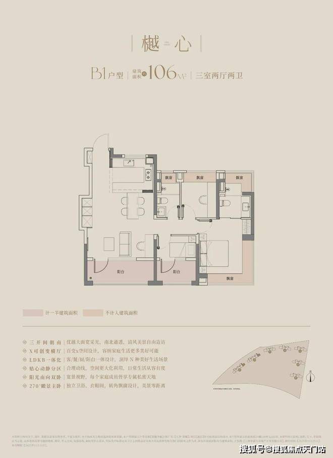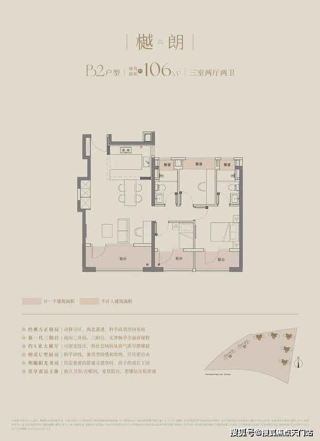 建面约106㎡的三房两厅两卫,3.5开间朝南,南向面宽达到约11.8m!碾压市面上以前的三开间朝南、10米面宽的三房户型。
