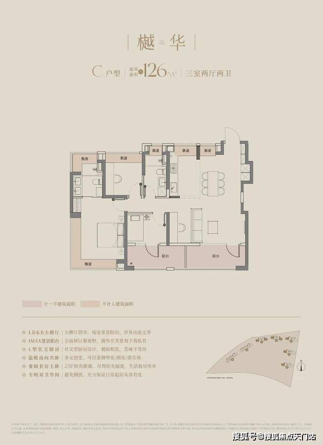 建面约126㎡三房两厅两卫,南向的总体面宽达到惊人的约13.2m,可以媲美市面上很多150㎡起步的豪宅产品的面宽了。