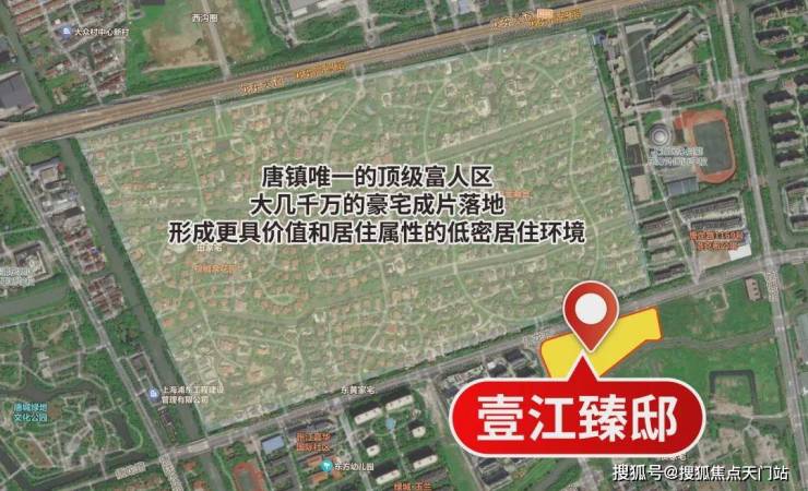 首先,它择址唐镇环境最好、圈层最高端的富人区,北面的三大顶级别墅区,起步总价就是约2500万+。