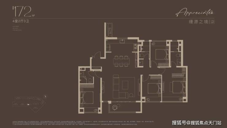 建面约172㎡4房户型,多娃家庭的进阶之选!奢阔尺度尽显家族气度!2梯2户, 子母双开门礼序入户,私密尊崇门厅;约16米四开间朝南 ,搭配约6米尺度横厅 ,揽四时风景入怀。