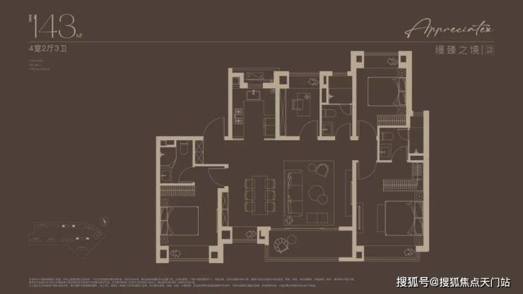 建面约143㎡四房设计,不论是三代同堂还是二娃家庭,都舒居无忧!2梯2户的设计, 极具私密性的入户门厅,彰显大宅归家礼序 。独立玄关,既是归家仪式感,更添收纳空间;约14米朝南面宽,搭配约7米尺度横厅 ,尽显大宅风范; 东西双套房设计,奢享全龄世家的静谧时光。