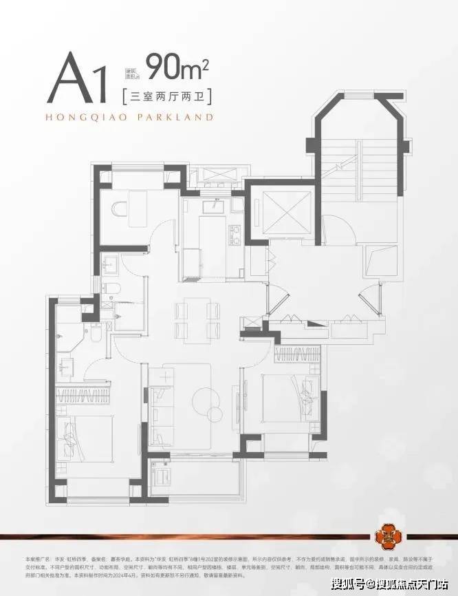 建面约90m²三房两卫户型同样是飞机户型,南北通透,全明户型,空间利用率极高!