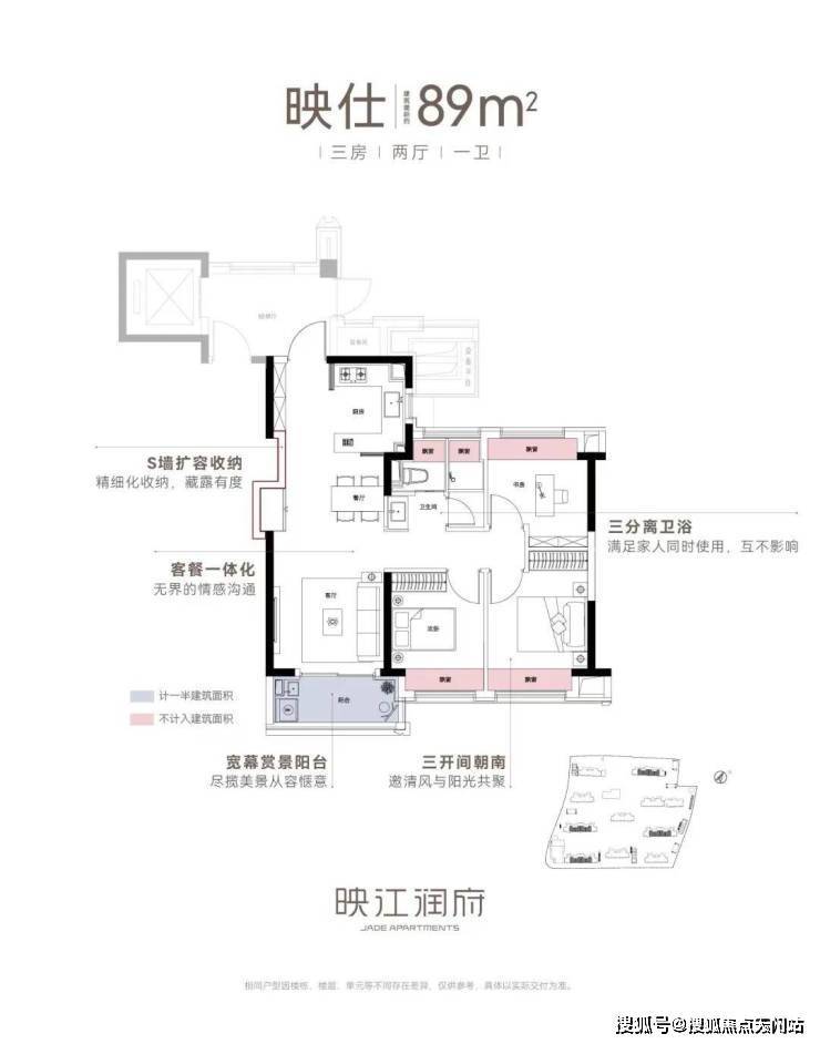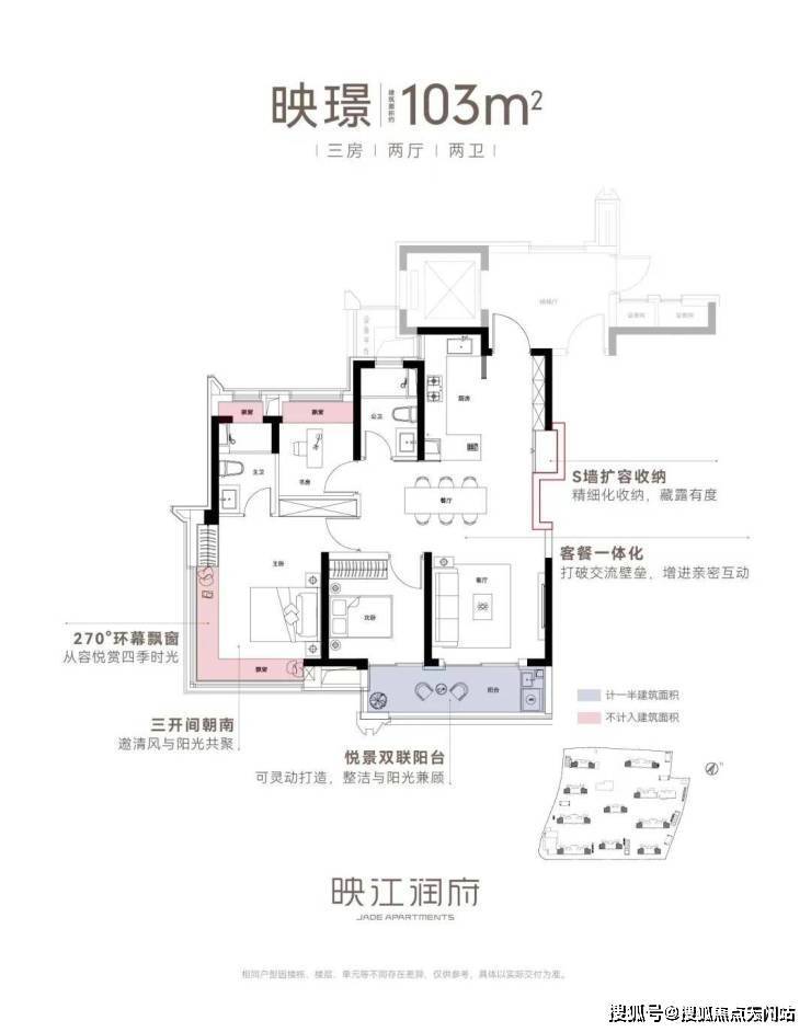 亮点一:270度环幕飘窗,通透主卧套房,对于卧室而言,常规的尺度延扩,不足以称为迭新。映江润府,103边套户型,引入了千万级以上豪宅之中才能够拥有的270度环幕飘窗设计,实现了极致的采光和观景体验。