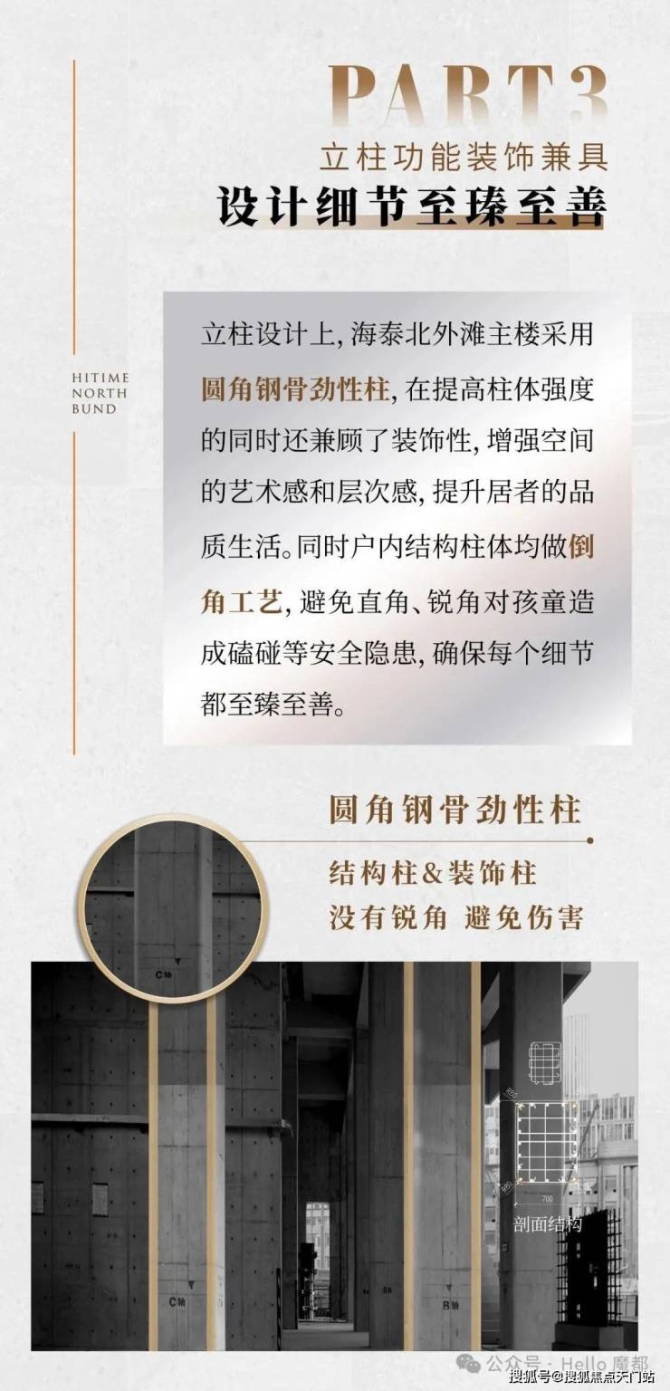 在结构安全方面,海泰充分吸取国内外经验,结合所处城市以及地块的地质条件,进行充分论证,对地基和基础、梁、板、柱等关键部件的设计与施工,都进行了更多安全方面的专业考量。比如,设计了框架体系、核心筒体系和安全屋等多道抗震设防体系,主楼采用直径800毫米桩长60米的钻孔灌注桩,间距2400毫米,呈梅花形布置,桩端采用后注浆技术,进一步提高桩身承载力;主楼结构柱采用圆角钢骨劲性柱,户内结构柱均做倒角工艺,安全与美观兼具。此外,海泰还在主楼的部分核心筒剪力墙内设置了型钢钢板,控制墙体截面面积;200-300mm的楼板厚度,远超常规120mm厚度的楼板,既安全又隔音。