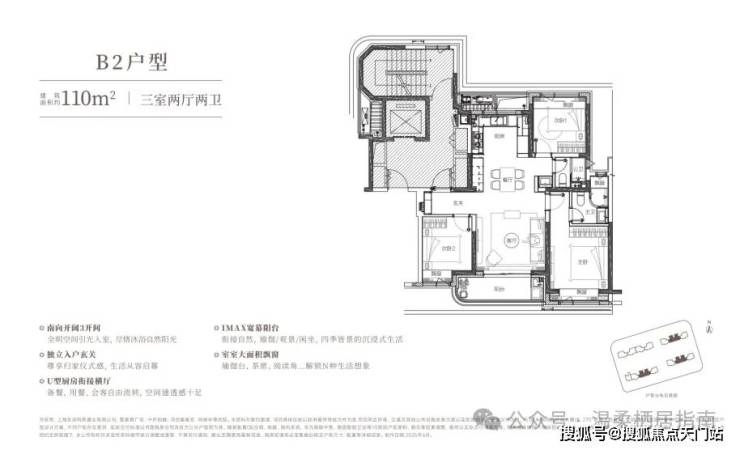 建面约 110㎡ 边套( B1户型) , 1 个 宽面阳台、 5 个 飘窗 , 整体南向面宽做到了约 12.3米,大横厅面宽约5.4米,带来超大空间体验和充足通风采光。更为难得的是,该户型标配了全屋飘窗,主卧更是拥有270°转角飘窗,拓宽室内景观视野的同时,增加了实际空间使用率,加上三玻两腔系统窗隔音,在欣赏窗外景色的同时,也不会被噪音打扰。建面约110㎡中间套 ( B2户型) ,也同样做到了南北通透,三开间朝南,洄游动线,布局合理,无论是空间尺度还是通风采光, 与 边套 享受一样的品质感 !