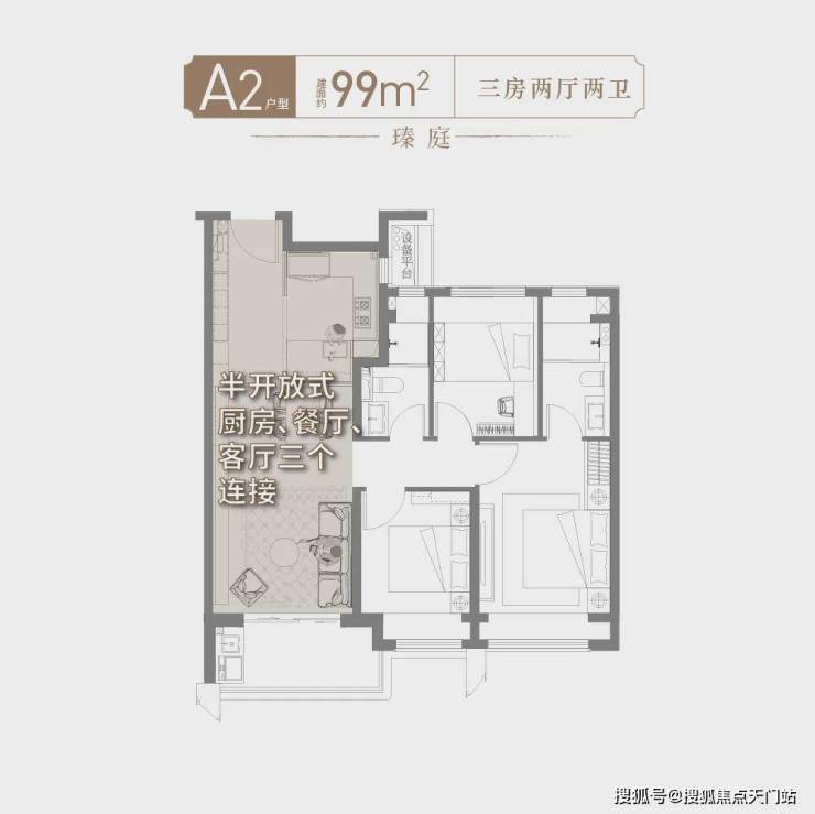 99㎡的户型,三个房间都可以做卧室,无论二胎或三代同堂皆可。