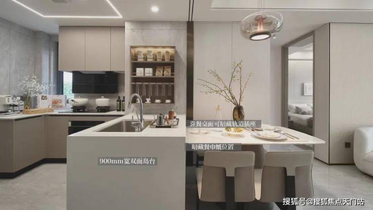 此外,99㎡的户型还设计有无界中厅,采用LDKB一体化设计,是典型的“非传统去客厅化”设计,开放式的厨房,这种设计,不仅拉大了视觉尺度,更让你在做羹汤时,能与客厅里的家人随时互动。