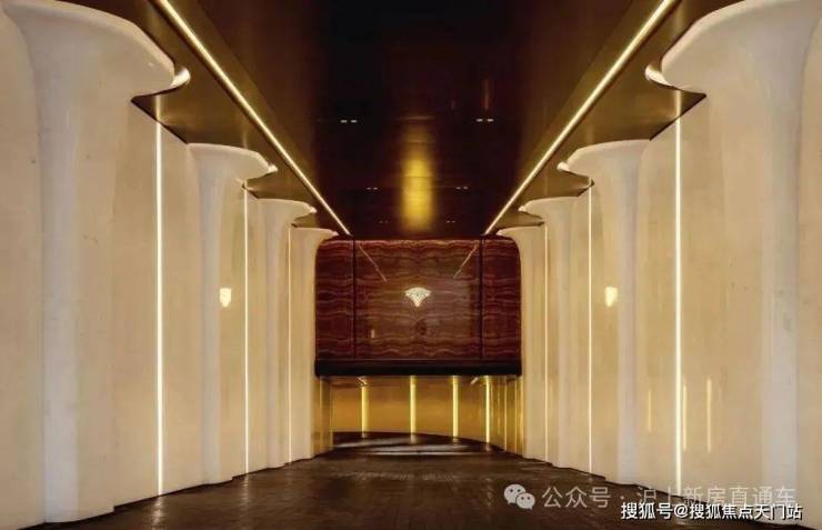 6、 社区含“奢材”量很高。门庭延街的外立面,以精工定制弧形 米色石材为主调,镶嵌典藏级 老虎玉大理石,点缀 古铜色现代海派艺术感灯器,整体呈现出百年海派的贵雅气质。