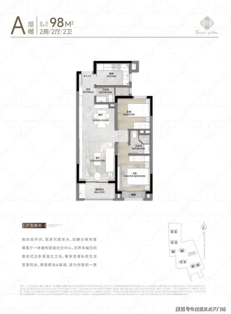 104㎡3户型特点: 该户型多为楼栋的 东边套,是一个观景户型。客厅连接270°阳台,视野出众。双卧朝南, 阳光满溢。从次卫布局看,如果家庭人口较少,该户型还能做成双套卧。