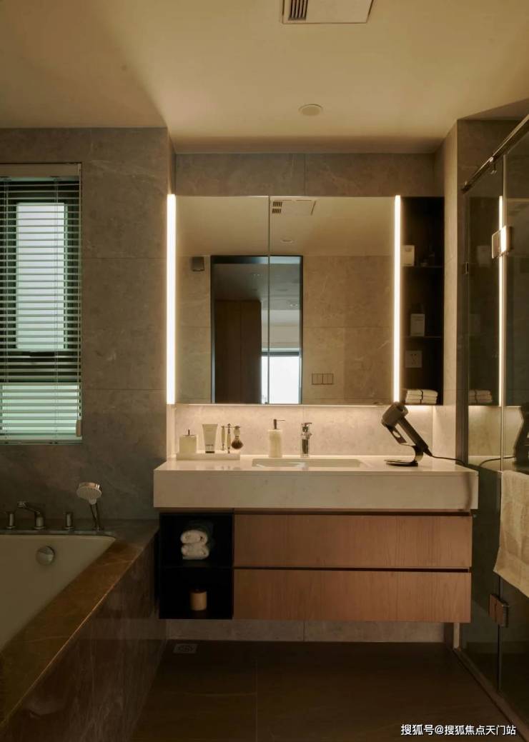 卫浴空间同样精彩,采用了汉斯格雅龙头、花洒(主卫)、百朗暖风机、摩恩龙头等高端品牌,像隐形地漏、镜柜内置插座等细节都考量到位!