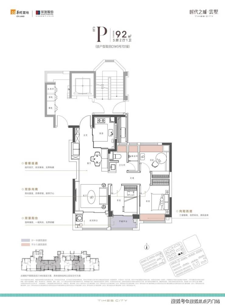 2、建面约92㎡的3房户型,高层产品同步共享南向双阳台,户型方正、南北通透、明厨明卫。S墙的设计利用空间错位放置冰箱,腾出了将近一个平米的厨房空间。