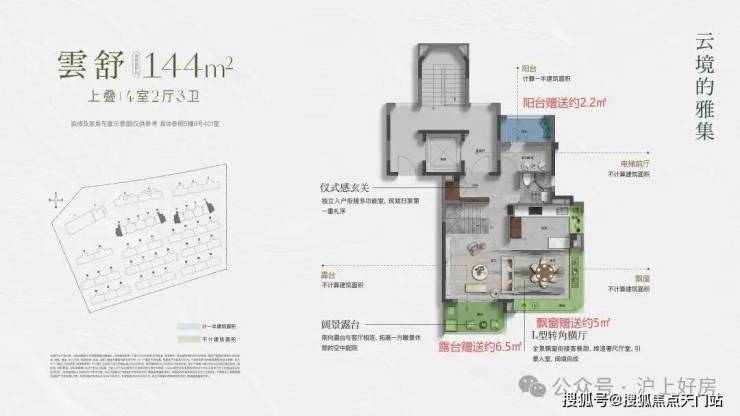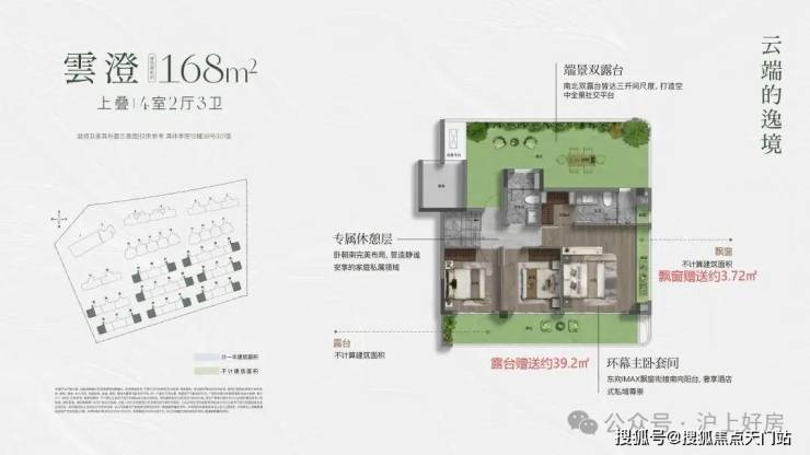 建面约144㎡的上叠产品,通过巧妙的 挑 空 、 总计 约 15㎡露台 及 灵动空间 设计,让户型的 实际可使用面积高达约180 ㎡,实得率约125%。