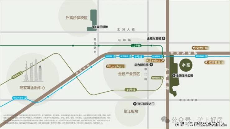 项目位于金桥东,金海湿地公园旁,9/12号双轨交汇,自驾出行的话周边有外环高速、金海高架路、往南还有龙东高架。从通勤角度来看,这是一个去陆家嘴、外高桥、金桥、张江都很方便的地段,可覆盖的人群非常广泛。