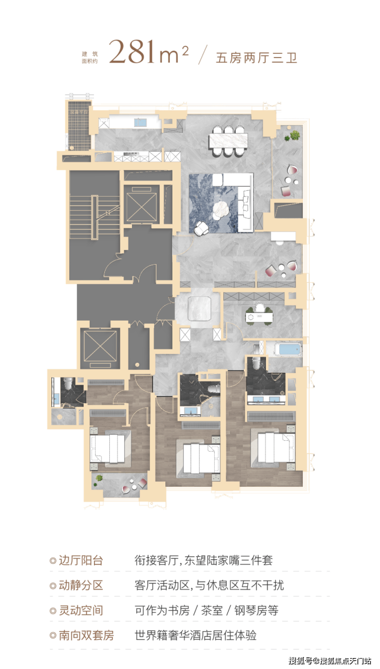 顶豪社交空间格局,普遍只有餐厅、客厅和阳台,该户型在南侧配置了一个家庭厅着实巧妙,可以是业主的茶室,也可以是女主人的手工室,当然也可作为X空间,随家庭结构和需求随心定制,书房、学习区、游戏区,女王化妆间等皆可。