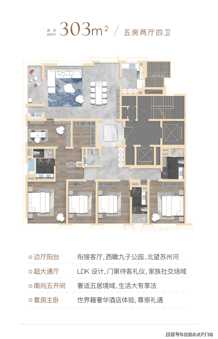 该户型只有极致景观楼层才有, 南向景观面达约13.5米,无遮挡,南向两个卧室均有很好的视线通达性。