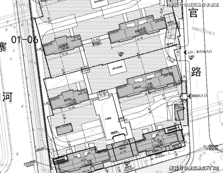 01-03(中间),规划10幢楼,其中一幢为保障房,总高17-18-20层,小区中心位置的商品一楼为架空层,南北楼间距30米。
