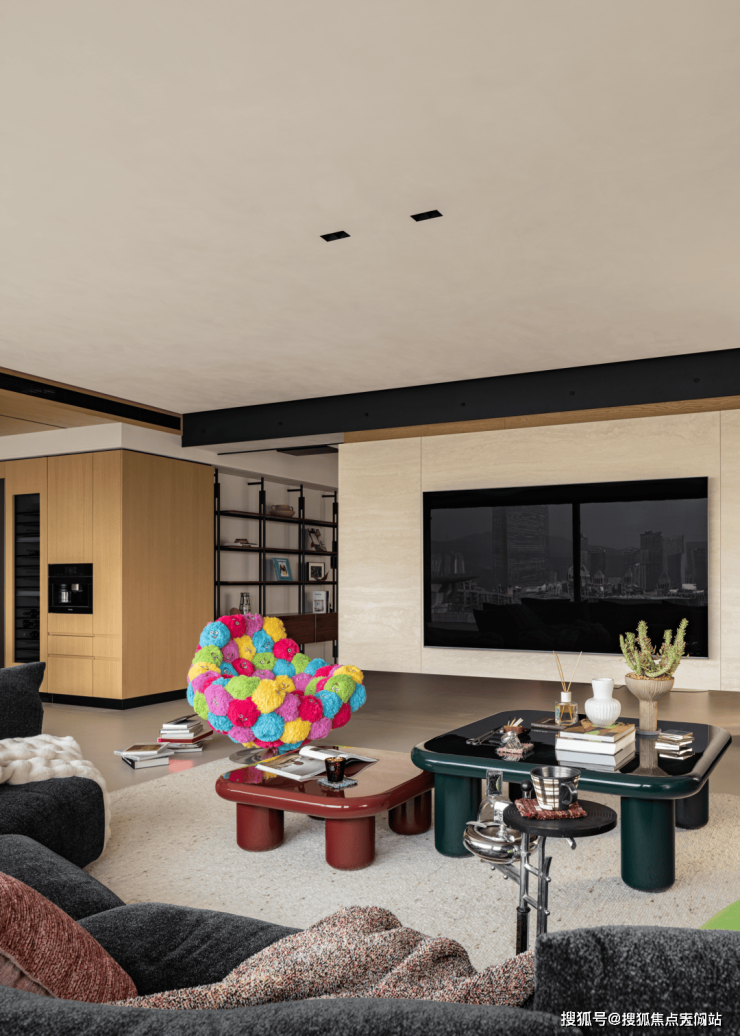 客厅色彩与光影交织,犹如复调的交响,层次分明,喧嚣与静谧并存,矛盾却不冲突。色块如同低语的音符,在空中编织,形成一种看似无序的秩序。售楼处电话 400-118-3159