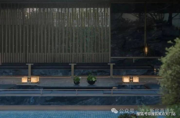 入口两边采用实体景墙与格栅形式,形成围合式院落空间,景墙前端采用奢石与金属点缀,墙面使用照壁灯有序排列,尽显奢侈度假风范。两侧阵列植物绿化,营造迎宾仪式感,凸显品质与调性。 院落内部设计采用了酒店式下落客的设计手法,中心圆形水盘聚八方之财气,寓意财源风水。圆盘水景中间选用特选造型树点缀,营造浓郁的度假氛围。配备豪华酒店式落客区的大堂设计,实现业主尊贵的归家仪式。