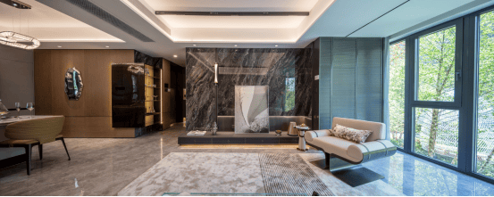 3、高端的爱马仕灰奢石打造的景墙,转角弧面犹如犹如翡翠赌石,优雅贵气。