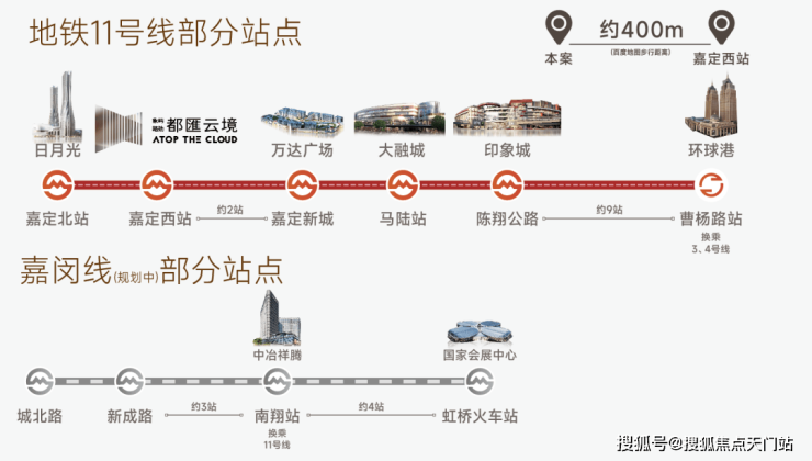 项目 距地铁站仅400米!(百度地图直线测距),而且 11号线+嘉闵线(在建中),双轨交加持!不仅可以通过11号线直达真如、徐汇、前滩等城心CBD,未来还可以在嘉定北换乘嘉闵线(在建中)直达大虹桥,出行非常便利。