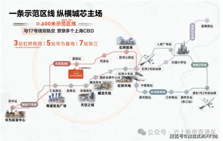 而示范区线(在建)左手长三角一体化、华为,右手前湾、大虹桥总部商办,并通过虹桥枢纽,串联2号线及正在试运营的机场联络线,把市中心、徐汇、闵行、张江等高能板块都纳入保利虹桥和颂·IN255的通勤版图。