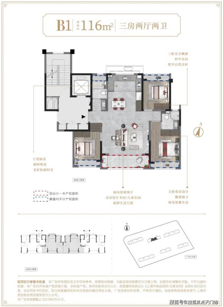 116m²户型特点:三卧室全飘窗 ,科学布局,悦享自然美好, 南向宽境客厅 ,灵动设计书房/儿童乐园,延伸生活尺度, U型厨房 ,阔绰明亮,美好私厨时光, 主卧套房设计,飘窗独卫 ,境见优雅生活。