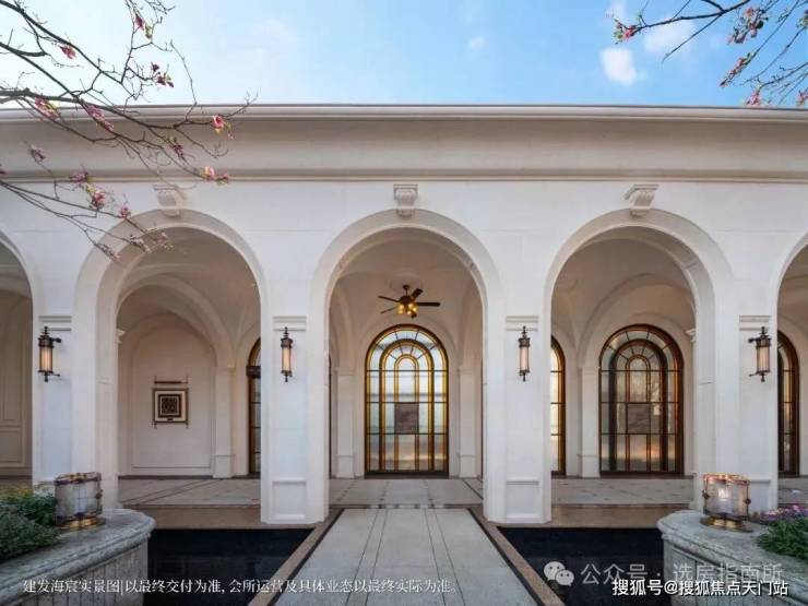 恢弘门头,豪气满满,宽约 65 米, 14 米挑高白玉兰造型穹顶,搭配水景喷泉营造归家仪式感。
