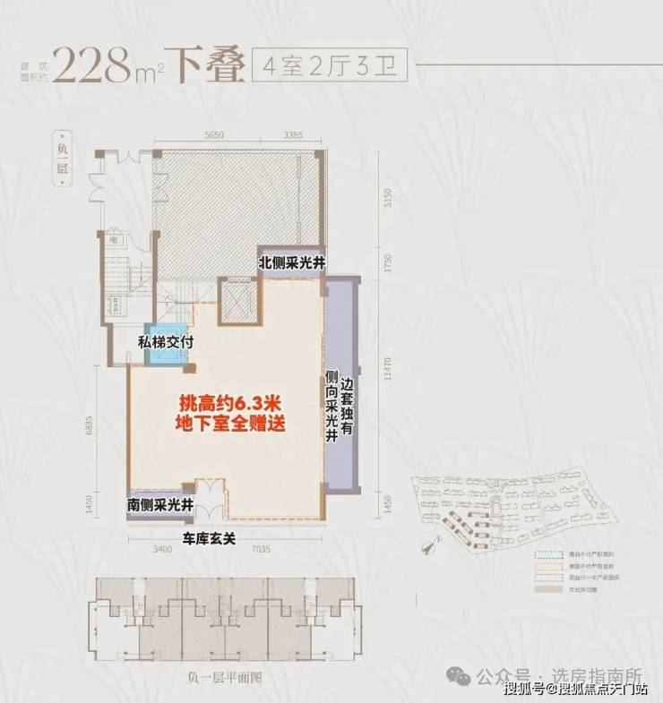 下叠户型地下单层面积约120㎡,层高达约6.3米,可以做双层使 用,增加夹层后, 地下空间可拓展至超200㎡ ,丰富的灵动空间足以满足业主的各类喜好!