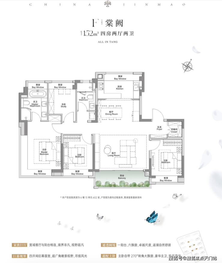 尤其主卧大套房自带270°转角飘窗,极致的环幕视野和采光,当真是当前百平左右3房少有。