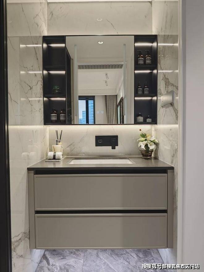 更好更奢的归家门庭,嘉佩乐酒店风格,海派元素充满空间的每一个角落,地面的复古花纹,金属镂空装饰墙,普拉达绿的奢石点缀,仿佛穿越到了摩登时代。