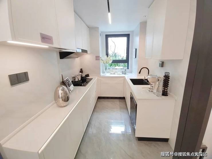 还配备大量收纳系统,例如多功能拉篮、定制亚光翻边造型柜体等。
