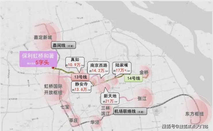 3)聚焦14号线沿线的新房价格,新天地约21万/㎡,静安寺约13.6万/㎡,南京西路约14.2万/㎡,陆家嘴约17万+/㎡,真如约10.9万+/㎡,而 保利虹桥和著售价预计 仅约5字头,妥妥的地铁14号线沿线的价格洼地!