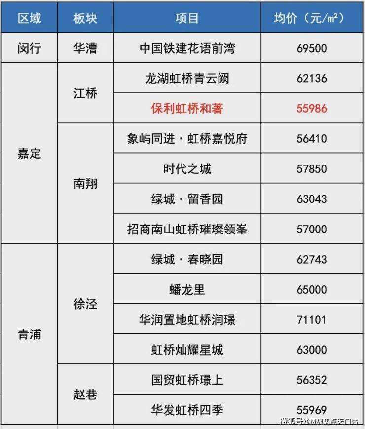 保利虹桥和著项目的均价 仅约55986元/㎡,堪称大虹桥板块最低价在售新房!与周边其他楼盘相比,价格优势十分明显。比如嘉定南翔的绿城·留香园 已高达63043元/m²;嘉定江桥龙湖虹桥青云阙也达到了62136元/m²。再看青浦徐泾的绿城·春晓园也达到了62743元/m²,蟠龙里更是高达65000元/m²。而闵行华漕的中国铁建花语前湾均价69500元/m²。