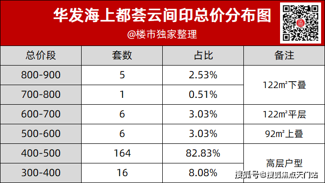 从价格区间来看,这批次【华发海上都荟云间印】的总价段,基本在300万-900万之间,其中400-500万的房源最多,共164套,占比82.83%,叠拼楼栋中的户型总价都在500万以上.简单来说,500万的预算就是分水岭,500万以上的预算就看叠拼,500万以下的预算就看高层。