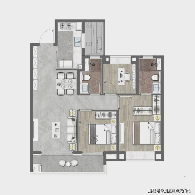 该户型做到了三开间朝南+超大面宽横厅+主卧套房设计+卫生间干湿分离+南北通透,功能性和尺度感完美结合。