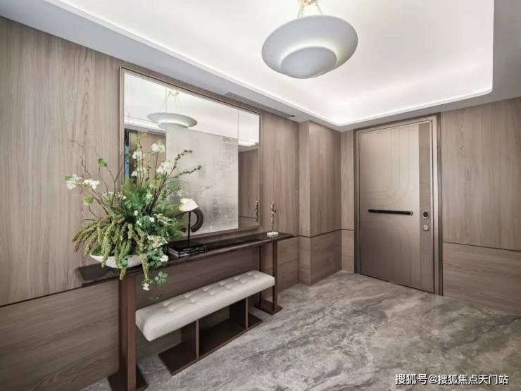 该户型外部呈 类一梯一户设计 ,将近10㎡的电梯厅空间成为家的延伸,配合门内玄关形成内外双玄关格局,大幅度提升了居家的私密性和仪式感。
