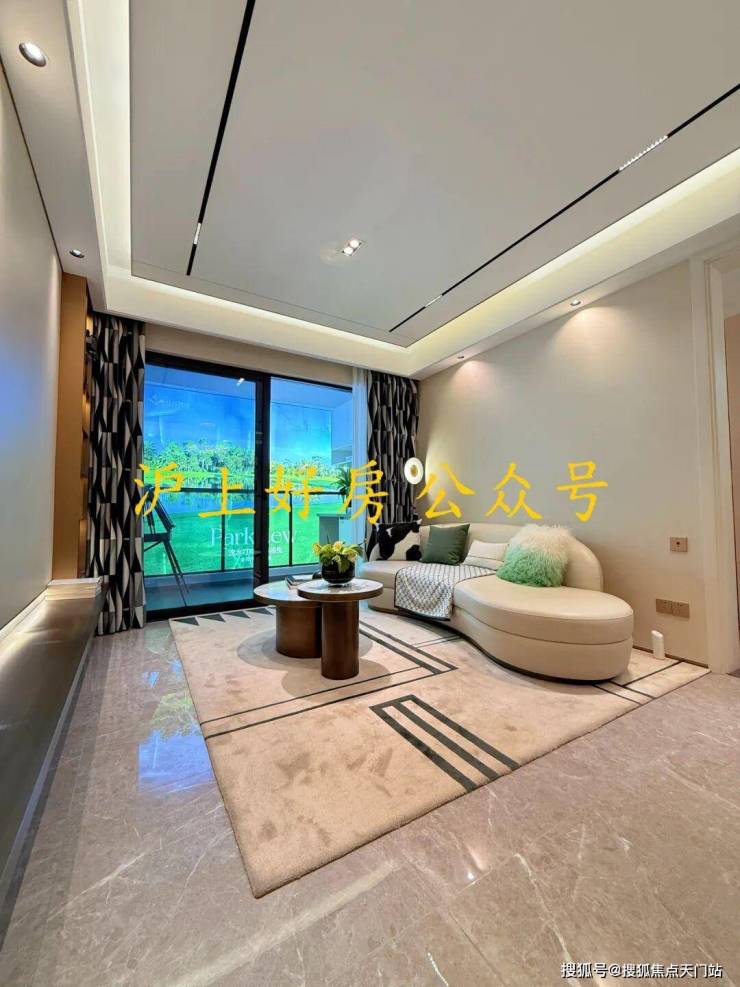 客厅和主卧都标配悬浮吊顶、无主灯设计,背景墙采用皮革和铝合金拼接,也都是实体交付的。