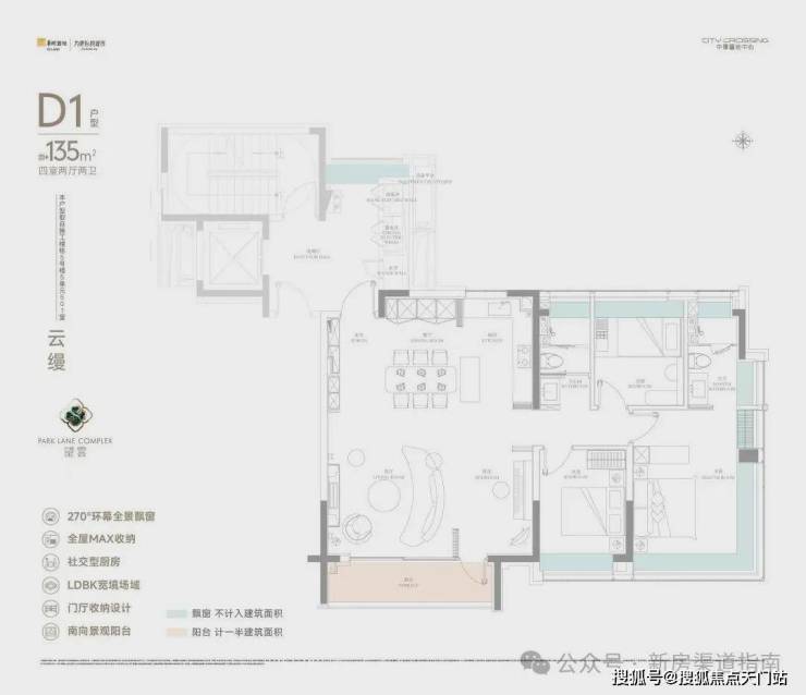 首先是进门即映入眼帘的LDBK一体化设计,搭配X灵动空间以及巨型宽面阳台,奢阔尺度非常出众;主卧约270°的转角飘窗,视野和采光全部拉满。