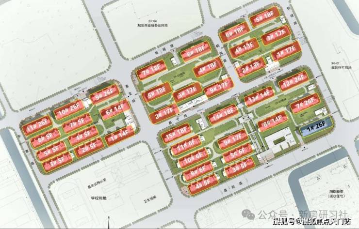 根据公示图显示,该项目的4个小板块最高层为项目东南角和西北角的26层高层,共有6栋,高度接近地块限高的80米(77.80米);18层的共有8栋;17层共有6栋;14层共有4栋;13层共有2栋;6层的共有4栋;5层的共有8栋。