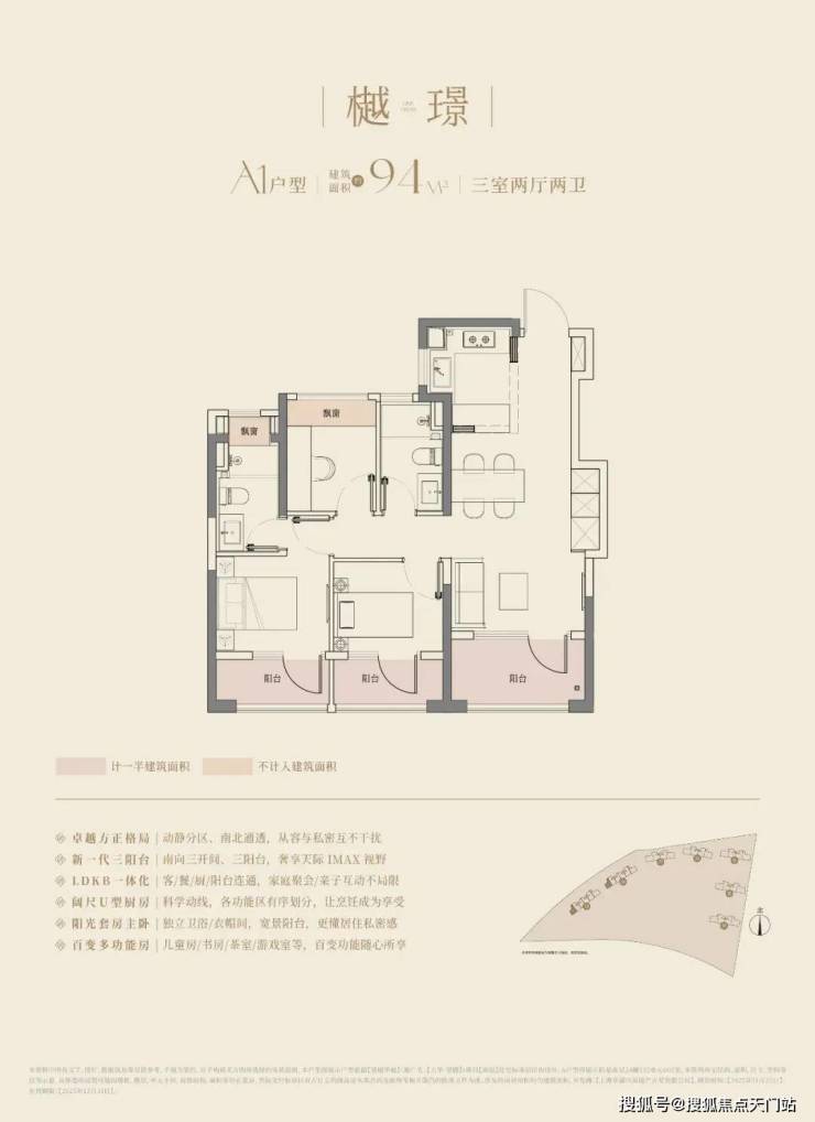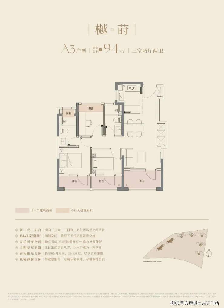 大华望樾的高层建面约94㎡户型做到了三阳台的配置;