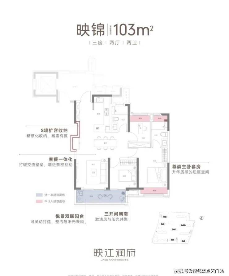 项目建面约103㎡中间套几乎保留了上述户型所有惊艳亮点,包括客餐一体化、双联阳台+多飘窗附赠、三开间朝南、套房主卧等。