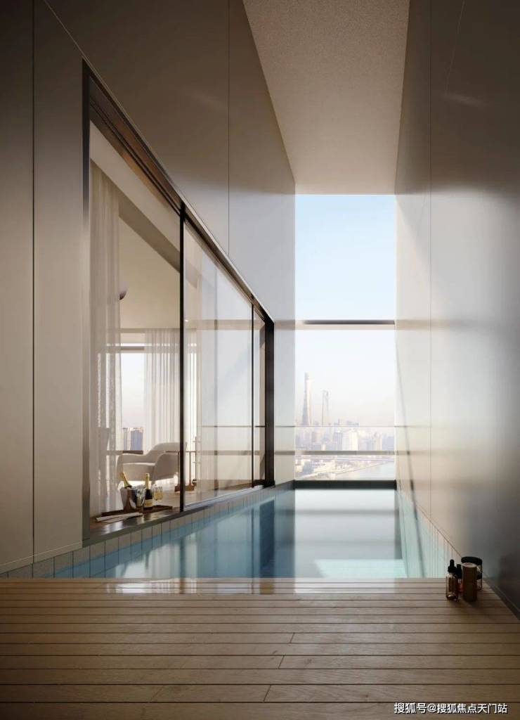 景观设计方面,保利世博天悦采用 引江入园、以水带路的手法,将滨江舒阔的国际生活平移到社区内,打造约 6万㎡景观秘境,媲美全球奢华酒店。采用大面积的留白和现代禅意的表现手法,呈现开阔舒展的质感。