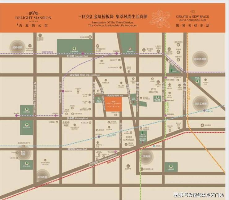 项目位于闵行金虹桥板块,毗邻古北国际社区,一路之隔是虹桥镇人民政府。西面除了金虹桥商业圈,还紧靠着文化名镇七宝古镇,南面毗邻徐汇漕河泾开发区,东面可直达徐家汇,属几大区域辐射的核心位置,距离虹桥交通枢纽约5公里。