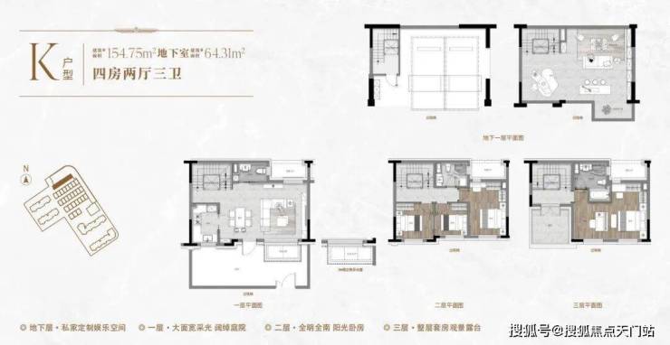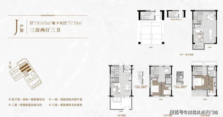 一楼和地下室主社交和志趣,二楼是子女的房间,三楼是主人休憩区。