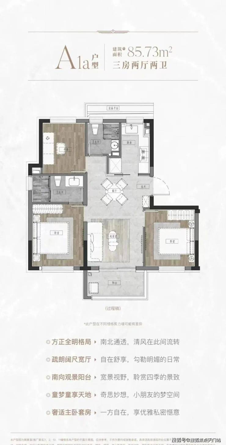 区别于市面上80多平2房或3房1卫,该户型做出了3房2卫的格局,功能性拉满,满足三代同堂/二胎家庭共居。