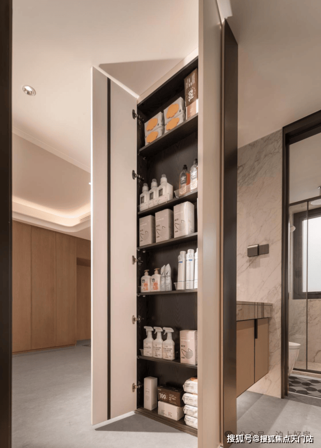 双薄柜设计则大大增加容纳空间,举例来讲,可容纳约200包纸巾,足以满足全家1年使用。而洞洞板设计,则可收纳清洁工具、长柄伞等大件日常用品,如此贴心布局,保证室内物品足够井然有序,也更为利于家庭日常打扫。
