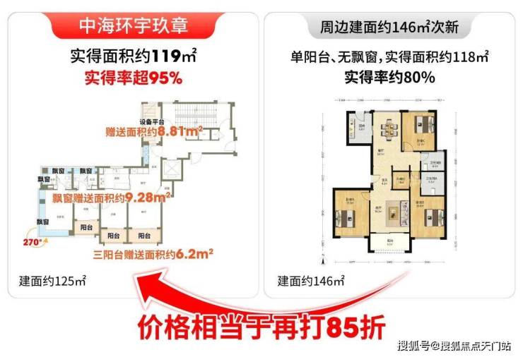 环宇玖章建面约125㎡户型实得率超95%,而周边次新实得率约80%,项目实得率足足高出约15%,摊算到实际使用面积,相当于项目单价再打“85折”。