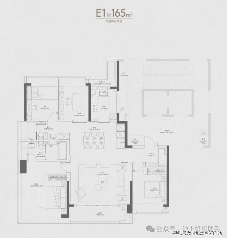 来到165㎡个户型,已经上升到上海主流的大户型改善面积段,但看设计思路,可以看出是为满足多胎家庭成长而服务的。