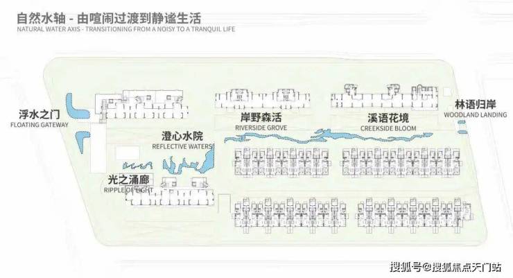 在社区内部,则通过一条 自然水轴,串联六大景观节点,步步皆景。