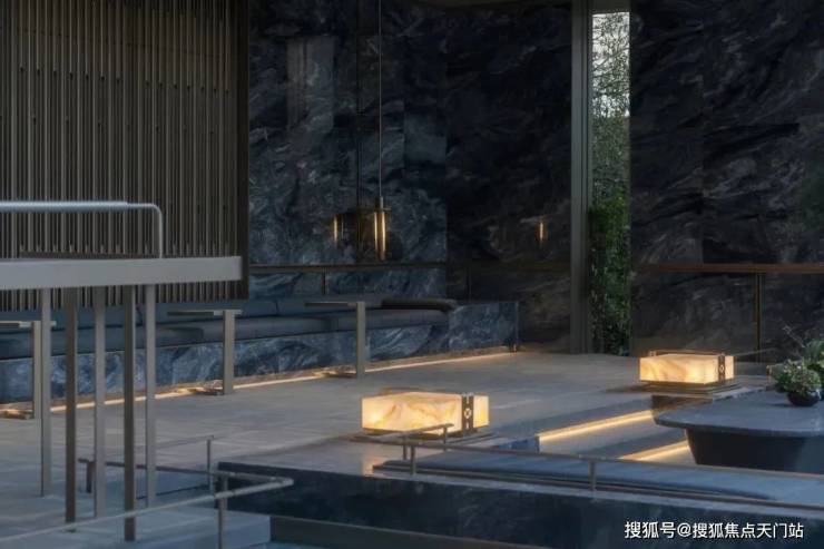 与森氧会客厅相接的是一处精心打造的度假戏水池,它不仅是清凉嬉戏的天堂,更是悠然自得的休闲圣地。下沉式的卡座巧妙地被清澈碧波轻轻环绕,为访客提供了一方私密而舒适的休憩空间。同时配备高端躺椅、阳伞增加度假氛围。池畔一侧,一抹别致的壁炉装饰更是点睛之笔,它不仅是视觉上的焦点,更象征着温暖与团聚。